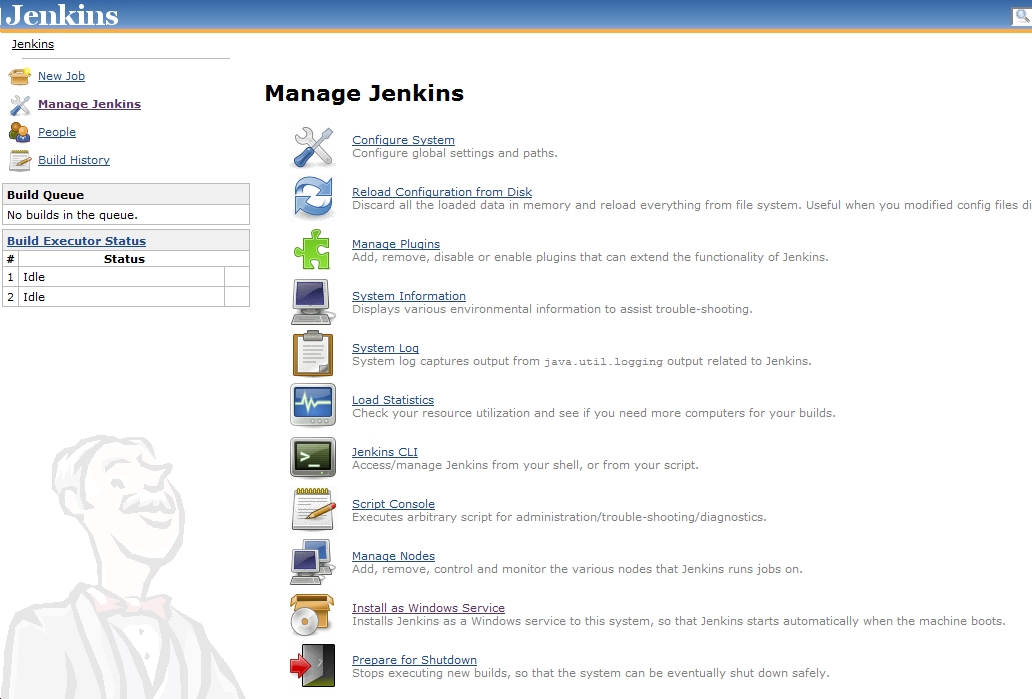 Believe it or not there is a plug-in for connecting to a Team Foundation Server to get the latest version of your source code. To install this you should follow the steps as outlined in this section. Open up a browser and go to your Jenkins home page. Once you get there you should click on the “Manage Jenkins” link as follows: