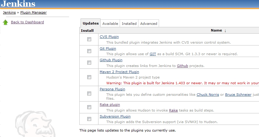 You should select the “Available” tab in the list and look for a plugin in the list called “Hudson Team Foundation Server Plug-in”. Select it and scroll to the bottom of the page and select “Install”. This should install the plugin for you and you should be ready to start connecting to TFS.
