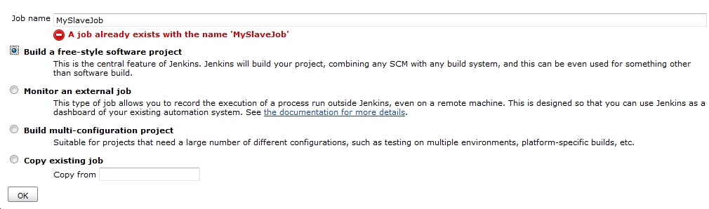 As you can see I selected to name my Job “MySlaveJob” and selected to build a free-style software project. When you click the OK button it should take you to the Configure page that looks like: