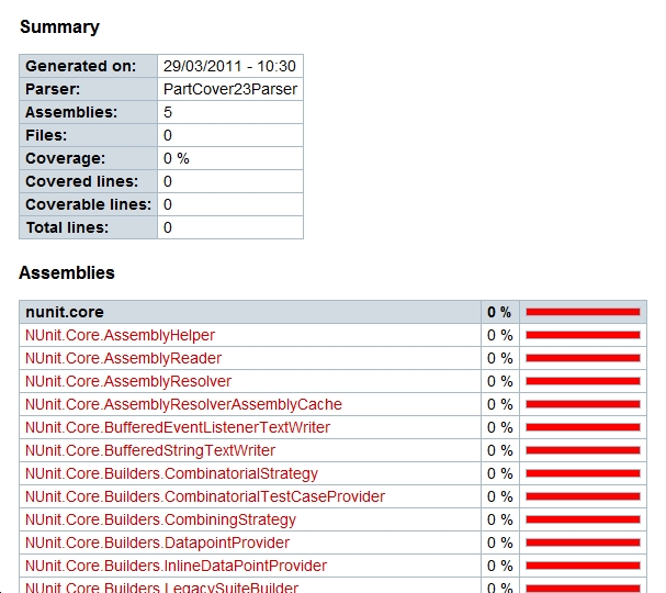 You should play with the command line to generate the Code Coverage a little bit to get rid of the Coverage being done on NUnit itself, but at least you now have a nice open source manner of doing this. This report allows you to drill down and can be customized to show in the way that you want it to show as well. I found this combination to work quite well and will stick to it, even though I’m still learning how to use PartCover itself.