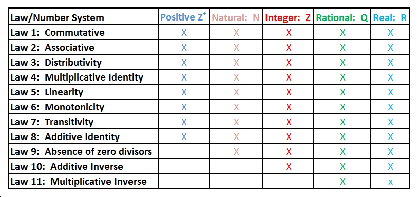 In this table you’ll see a short summary and yet another way to put what we already have above. For some people (like me) it helps to have more than one way to see things. I like short and concise, so here is a table showing the Number System and the properties that pertain to them.